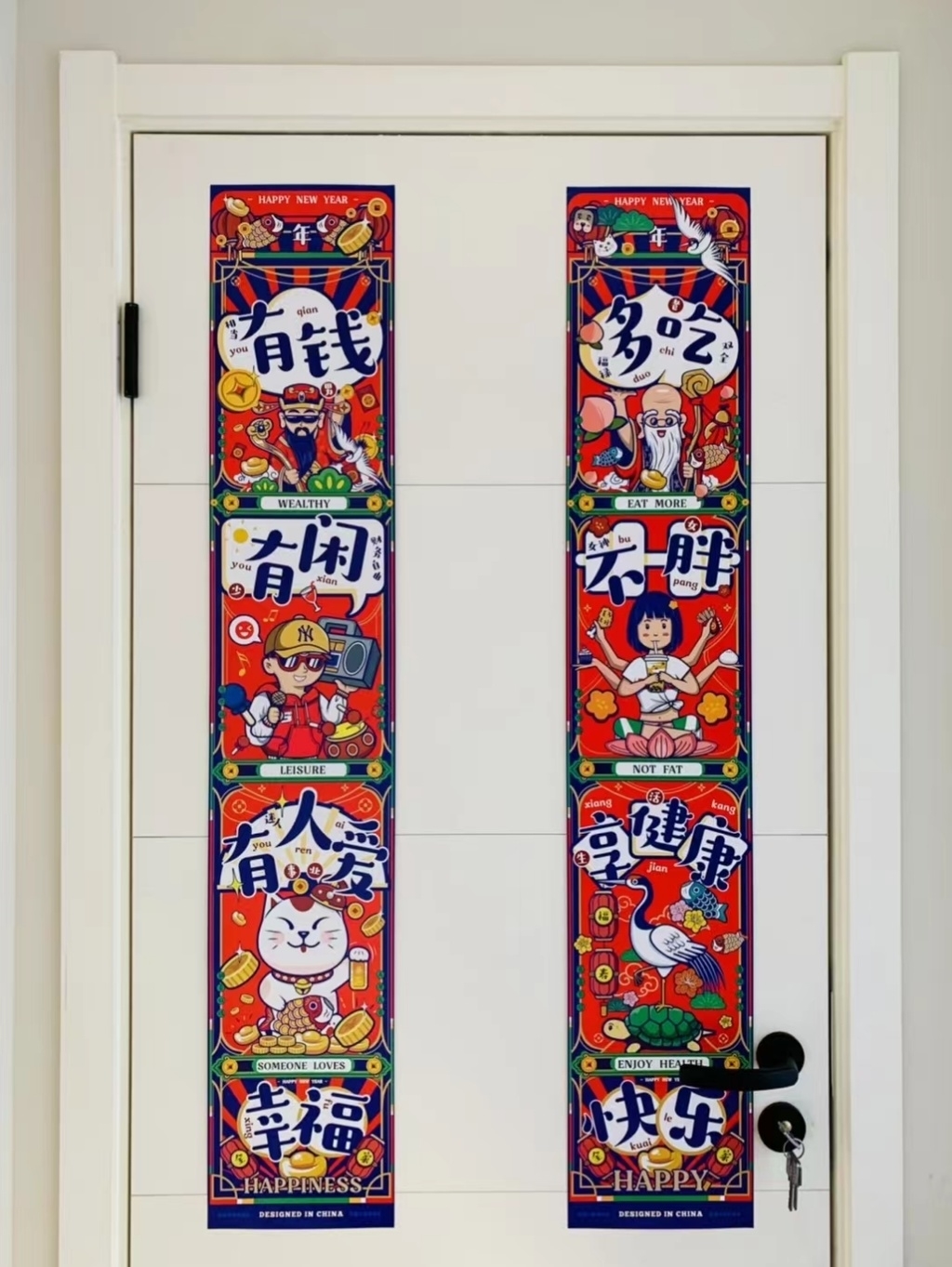 一批“反套路”的创意春联,也在今年流行开来。成都街头艺人郭颂兰贴的春联,就意趣满满,“有钱 有闲 有人爱 幸福;多吃 不胖 享健康 快乐”。除了文字内容有趣,对联漫画风格明显,红底蓝字里,传统的财神、元宝、仙鹤和现代的招财猫、K歌青年等图像混为一体,妙趣漫画,配着网言网语,青春时尚风的春联,让人眼前一亮。这条发在朋友圈的春联也收获了不少人的点赞。