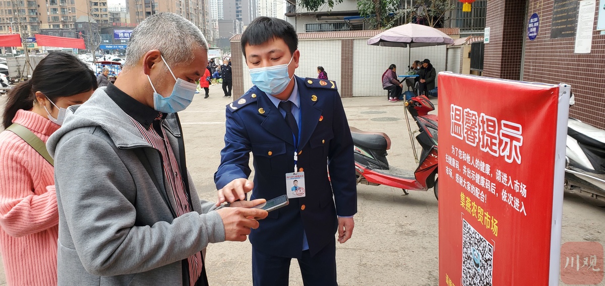 “师傅,麻烦出示健康码,来量下体温。”2月16日上午,自贡市荣县集燕农贸市场大门口,荣县市场监督管理局工作人员陈滔,为前来购物的群众测量体温验证健康码后,又进入市场进行巡查。