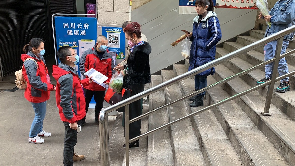 “大爷,出入市场请佩戴好口罩。”“大妈,您的手机是老年机,无法下载申领四川天府健康通。请检测一下体温。”