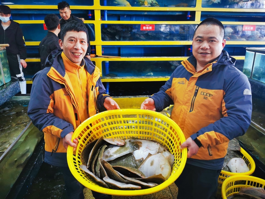 在海鲜区,“海景海产”的商家刘永金率领几个伙计正在忙着从车上卸货、补货,他们将一筐筐多宝鱼过称后、倒入水池。他告诉记者,节前他们从上海、厦门、海南等沿海地区陆陆续续调货,因此在成都这样的内陆城市过年过节的海鲜货源是非常充足的。“有各种海鱼,还有各类进口海鲜水产品,加上鱼、虾、蟹等,我们的销售量每天有两三万斤。”