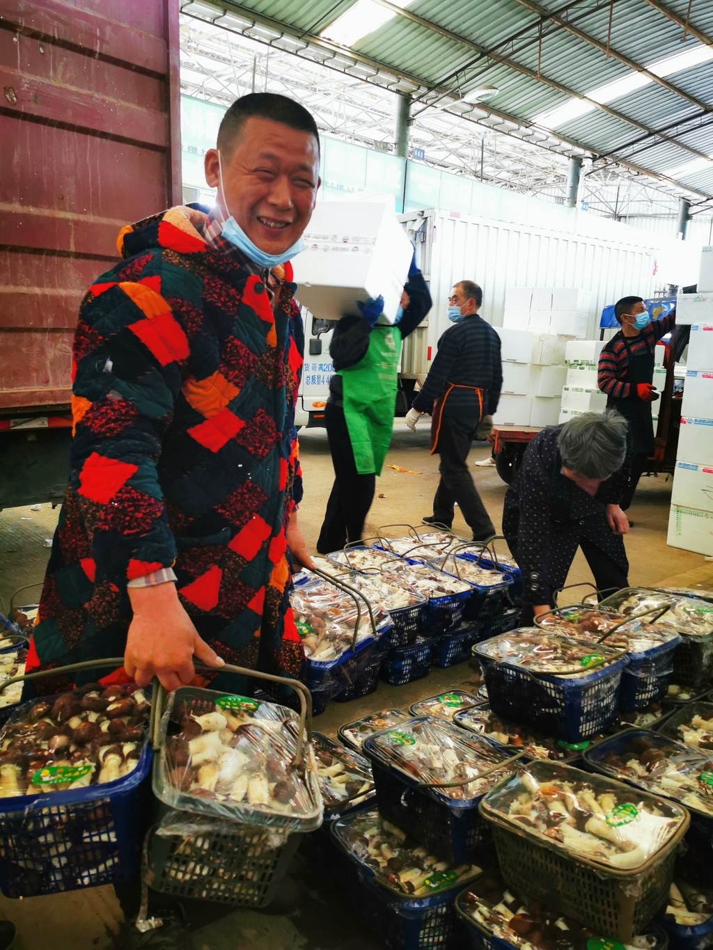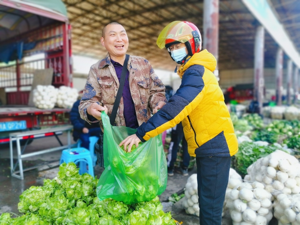 一旁,郑昌林等蔬菜商家也是一脸喜气地打理着各自的摊位、货品。当天,郑昌林主打的是儿菜,由于品相新鲜大受买方青睐。