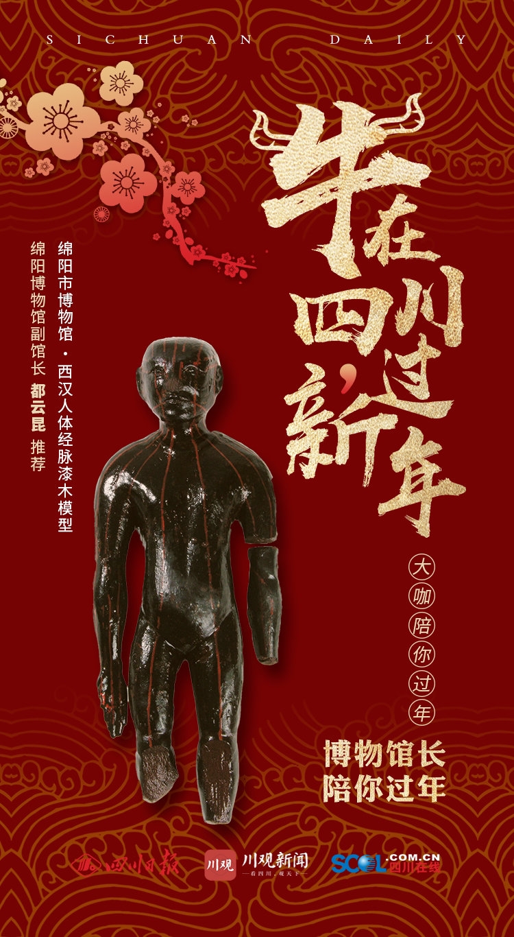绵阳市博物馆副馆长都云昆带来的这件“西汉人体经脉漆木模型”,1995年在绵阳双包山汉墓被发现。尽管它四肢均有残缺,出土后条件有限只能泡在水中保存,却因为是中国现存最早的人体经脉模型,在考古界和医学界引起巨大关注,出土次年就被评为国家一级文物,成为绵阳市博物馆的“镇馆之宝”之一。