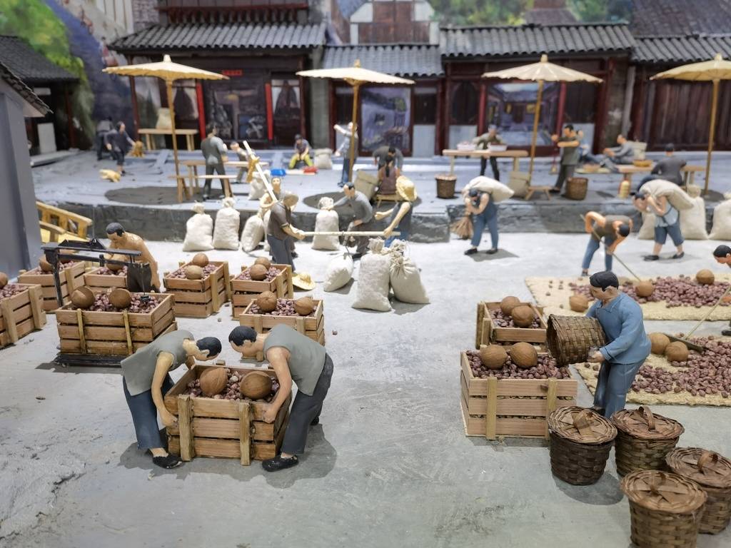 基地中,几名妇女手持竹竿做的长长修剪刀,将树上的核桃钩落在地;院坝里,一群男人光着膀子,把一箱箱晒干的核桃抬上货车……这是2月18日,记者在广元朝天核桃博览馆中,看到的一幅朝天农民喜收核桃的微缩场景。