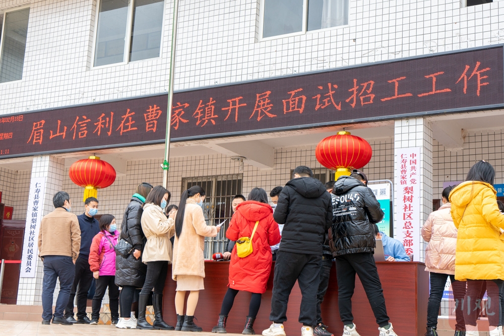 上午10点过,四川在线记者驱车来到仁寿县曹家镇梨树社区,果然见到仁寿县农民工服务中心副主任马列、人才回引股副股长普外伟正在企业面试现场忙碌。原来,为了让农民工少跑路,仁寿县农民工服务中心和曹家镇联合组织了一批有本地务工意愿的农民工,又将有用工需求的企业组织到梨树社区集中招工面试,农民工在家门口就可以完成找工作和面试。