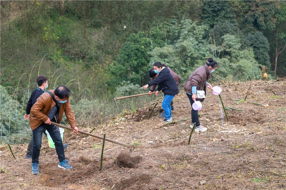 挖坑、放苗、培土、浇水……干部职工们或两人一组、或三五人搭档,合力栽下一株株竹苗,“播种”绿色发展新希望。