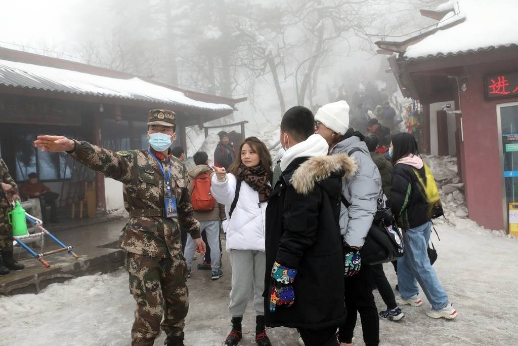 搀老人、抱小孩、上冰爪……哪里有游客,哪里就有武警官兵的热情服务。长时间的室外执勤,让不少官兵的脸颊、耳朵和双手都被冻得通红,肩上和帽檐上也落满了积雪。