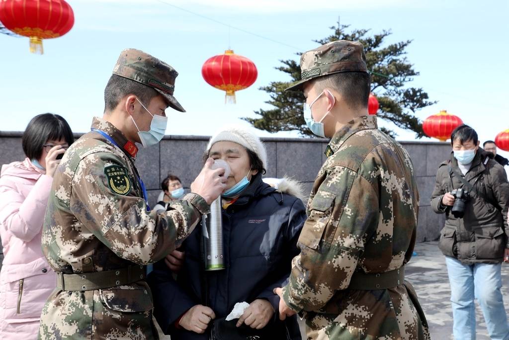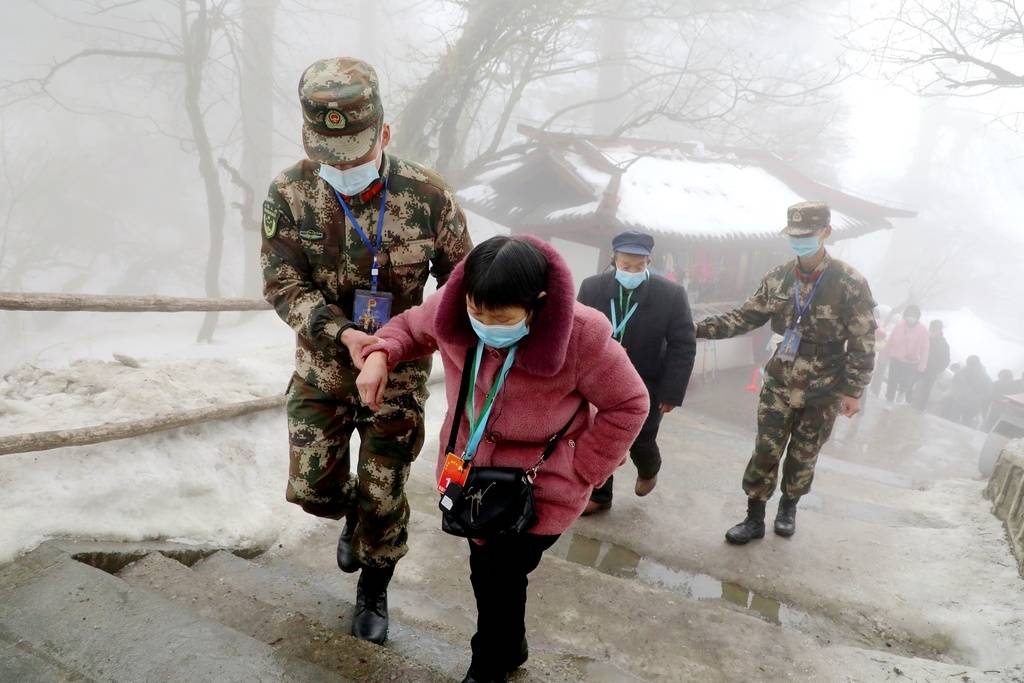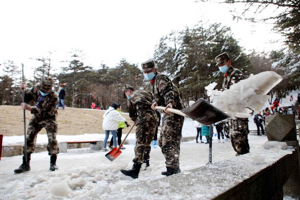 一路上,官兵们扶老携幼,不断派出人员在冰滑地段、缆车道等重要险点执勤,帮助游客排忧解难。
