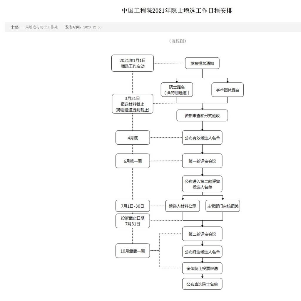 按照中国工程院2021年院士增选工作流程图显示,增选工作由今年1月1日启动,3月31日为报送材料截止日期,10月最后一周公布当选院士名单。