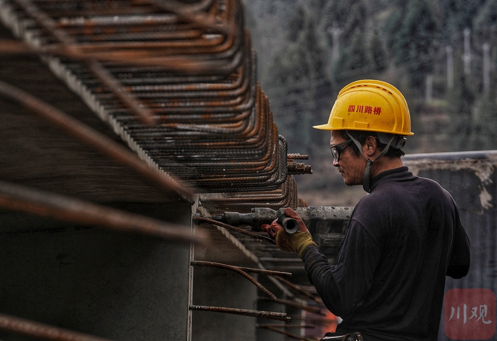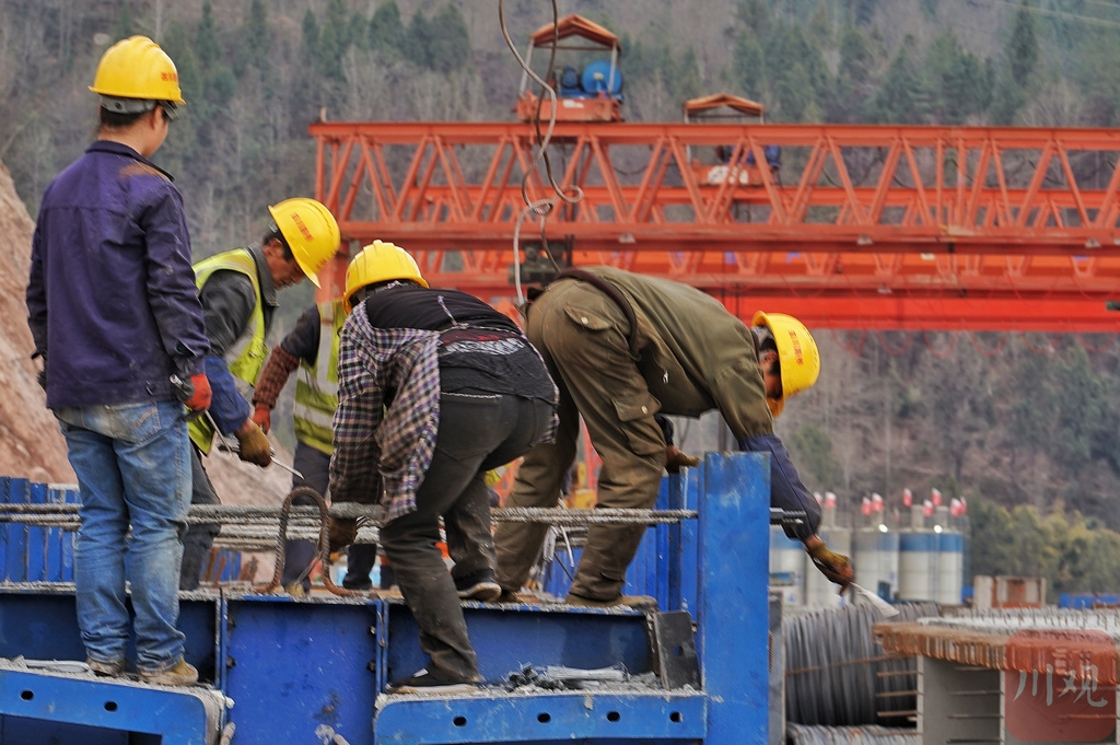距文胜隧道进口处不远的王坪互通,一段已完成的路基被改成制梁场,4排基座上放置着模具和已经预制好的梁板,几十号工人埋头干活,绑钢筋、关模板、注入混凝土……各司其职,有条不紊。王绪刚告诉四川在线记者,1标要用6个月时间制梁1102片,时间紧、任务重,春节期间制梁场工人一天也没休息,确保建设如期推进。