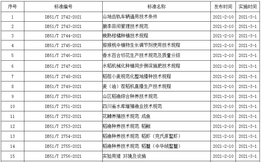 2月19日记者从四川省市场监督管理局获悉,近日,该局批准发布《山地齿轨车辆通用技术条件》等30项地方标准,其中涉及中药材、公共机构能耗、机关事务标准化指南等。