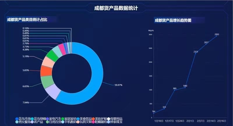 据“成都货”产品类目统计显示,花鸟市场占比超半数以上,达59.97%,其他排名靠前的分别是农产品占比7.94%,日用百货占比6.65%。