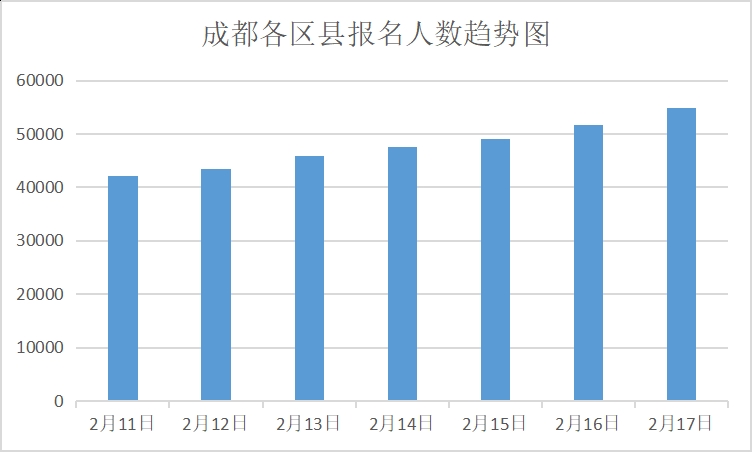 目前,金堂县暂时领先,排名第一,温江区紧随其后,其他各区县都在紧追不舍。2月17日,成都各区县新增报名人数3237名;2月16日,成都各区县新增报名人数2650名……