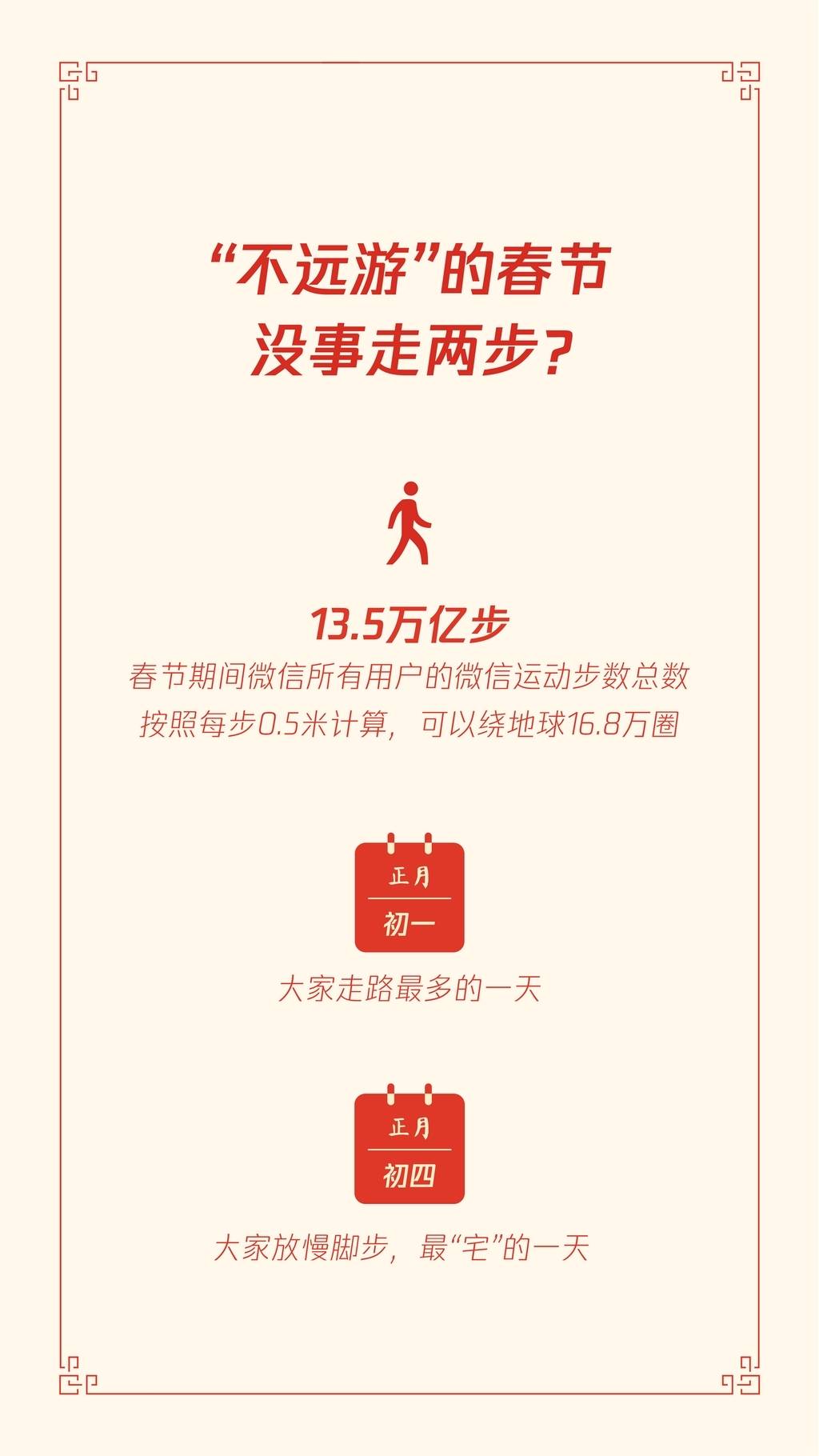 数据显示,适合早起拜年的大年初一,是微信用户走路最多的一天,而大年初四,则是大家放慢脚步,专心“宅家”的一天。