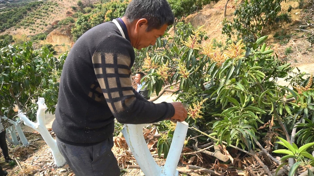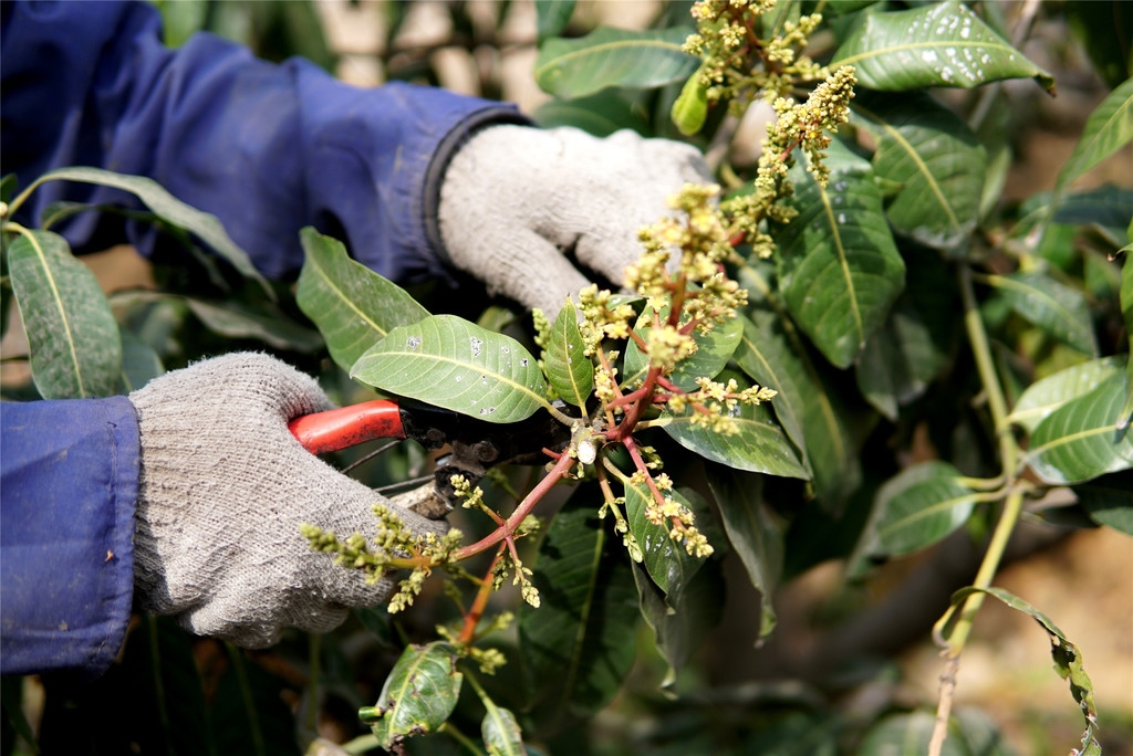 这是芒果生产春季管理的重要一环。“第一批花剪掉不要,过段时间就会长出新花,可推迟芒果成熟期,实现错峰销售。”有着多年种植经验,李地波深知控花的时机和技巧,“要赶在春节后10天控完,效果最好,免得只发新芽不开花。”