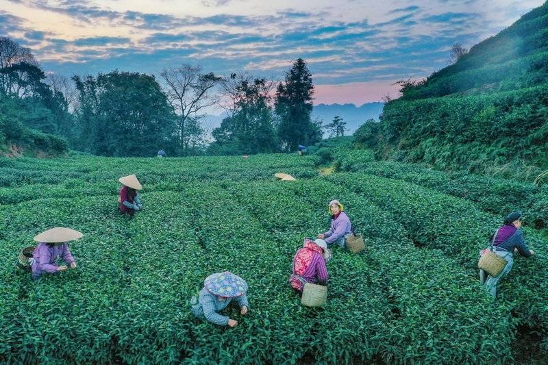 今年春茶开采早!2月22日,晨光熹微,雅安市名山区新店镇的茶山上,嫩绿的新芽迎春俏立,饱含雨露和旖旎春光,茶农们穿梭在茶园中,抢抓农时采摘春茶芽。