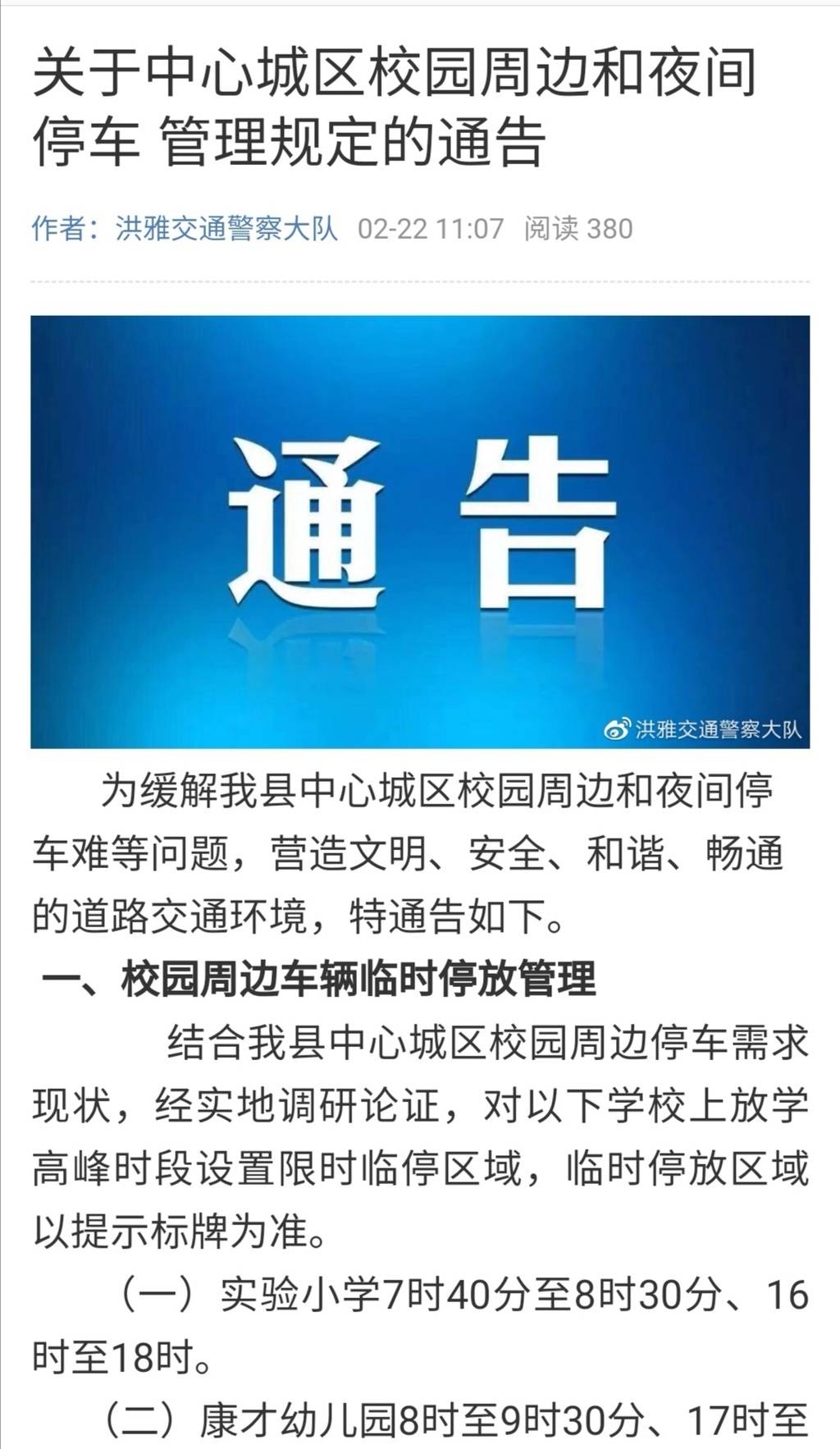 2月22日,记者从洪雅县公安局交通警察大队获悉,为缓解当地中心城区校园周边和夜间停车难等问题,以便营造文明、安全、和谐、畅通的道路交通环境,日前该县发布了《关于中心城区校园周边和夜间停车管理规定的通告》,并从即日起,放开城市停车。