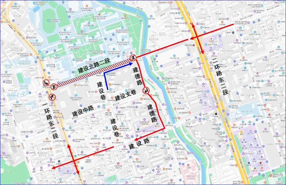 道路封闭施工后,原经建设北路二段由东向西进城车辆,需提前在二环路与建设北路三段交叉口转换至建设路(或府青路)绕行;或在建设北路二段与建德路交叉口左转,经建设路绕行。
