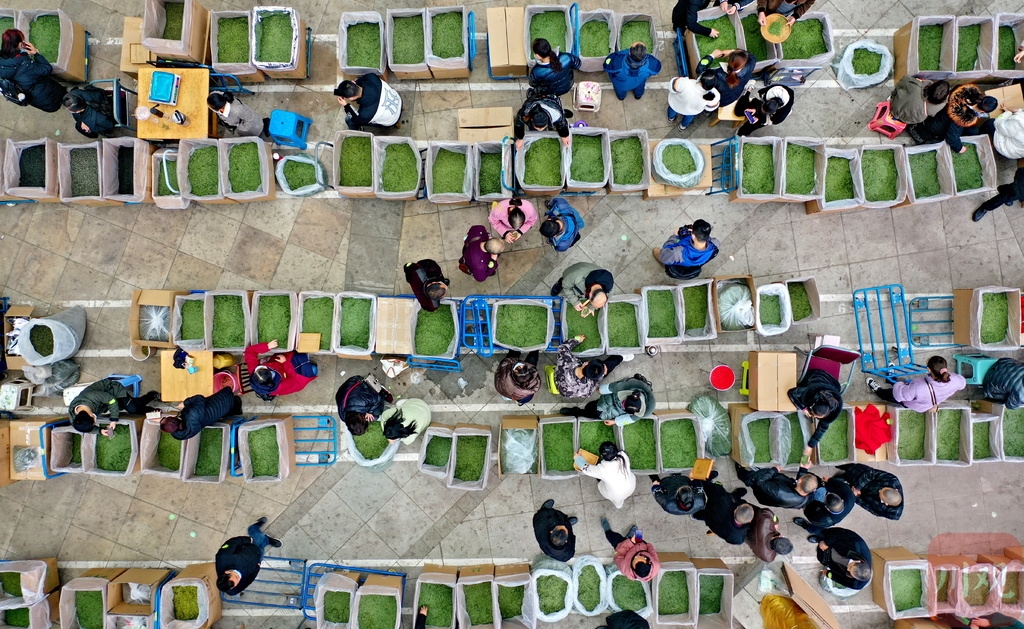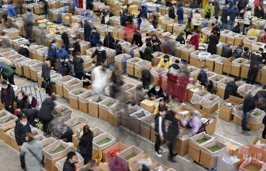 2月26日,在雅安市名山区“世界茶都·茶叶市场”,茶商在“茶海”里选购茶叶。