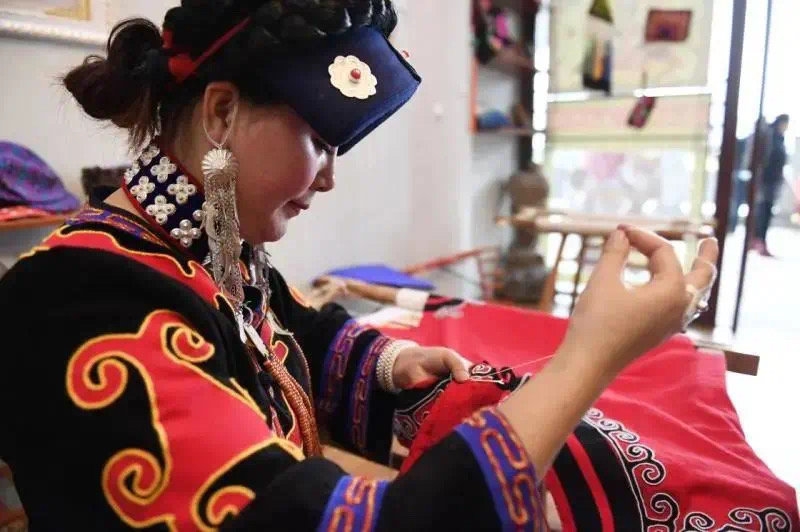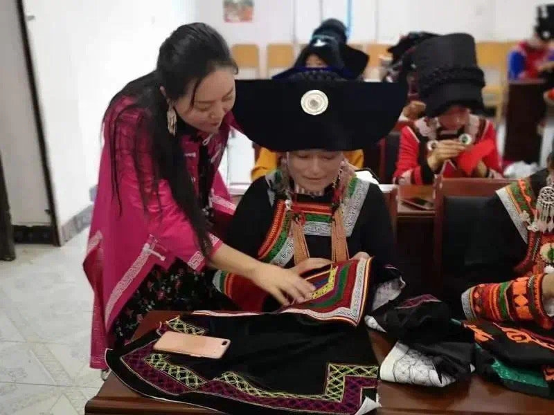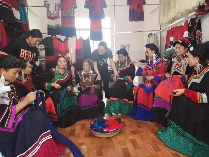 同时,合作社负责寻找需要刺绣加工的厂商企业,包揽加工业务,免费为绣娘提供剌绣原材料,回收成品代为销售,带动300余名妇女“零投入”实现居家灵活就业,累计带动800余人人均年增收超过8000元,真正实现“背着娃娃绣着花,养活自己养活家”。马边花间刺绣专业合作社的成立与发展,不仅促进了农户增收,也让彝绣这项非遗技艺得以继续传承和保护,走出了一条极具特色的技艺传承、乡村振兴之路。