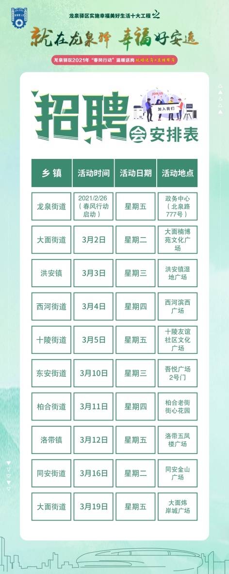 接下来,区人社局也将陆续在大面、洪安、西河、十陵、洛带等街镇,针对下岗失业人员、退役军人、农民工、高校毕业生、残疾人、就业困难人员及其他有就业意愿的城乡劳动者开展线下专场招聘会,让求职群众“求职有门、就业有路、困难有助”,让用工单位“招工不发愁、用工有选择”。