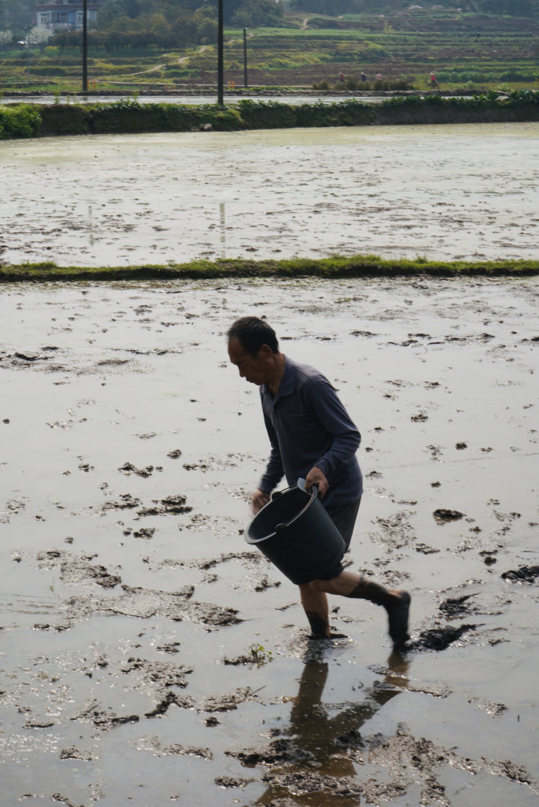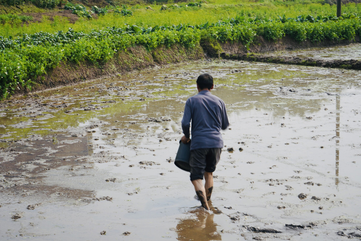 雅龙专合社示范基地内,农民卷起裤腿赤脚走在田里,正在撒播水稻种子。魏冯摄