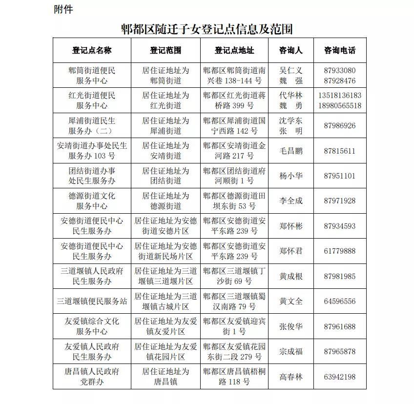 郫都区随迁子女登记点信息及范围