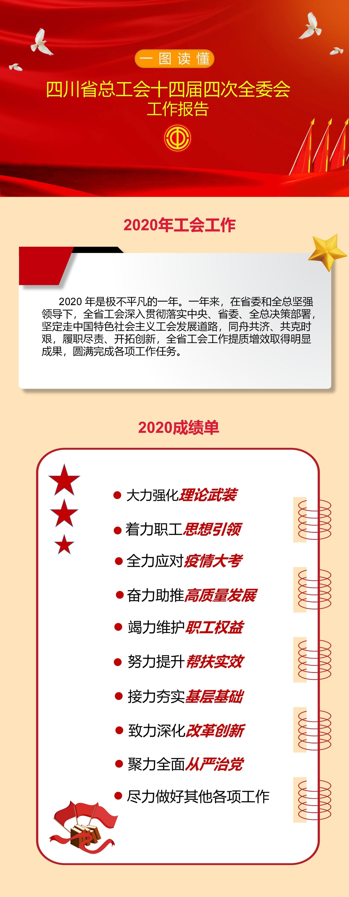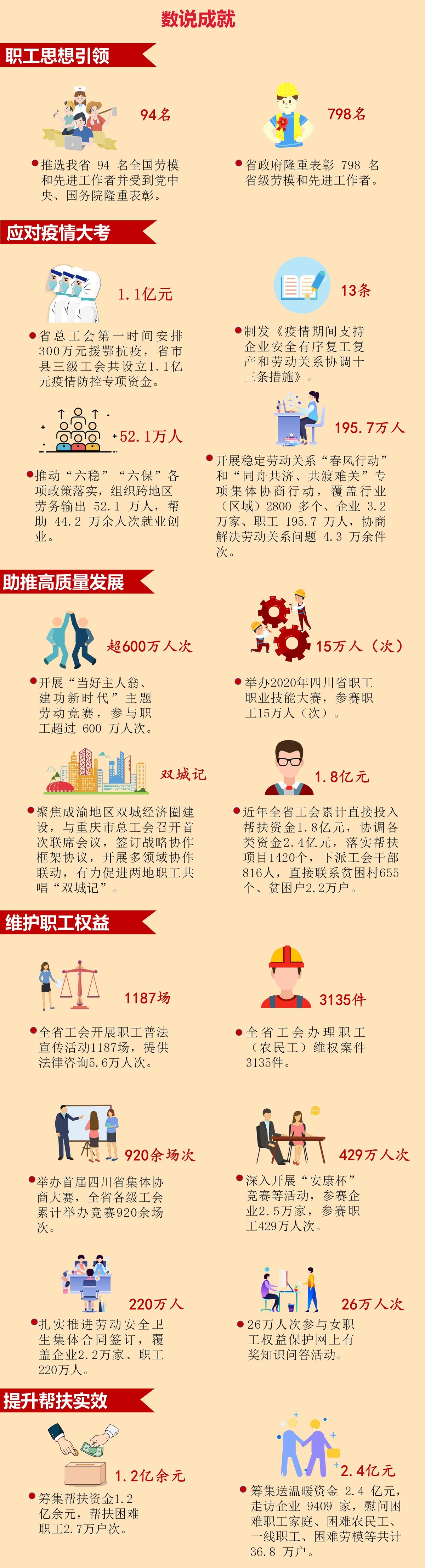 刚刚结束的四川省总工会十四届四次全委会上,题为《继往开来开拓奋进团结动员全省广大职工为全面建设社会主义现代化四川建功立业》的工作报告,亮出了2020年全省工会工作成绩单,明确了2021年工会工作行动路线图。