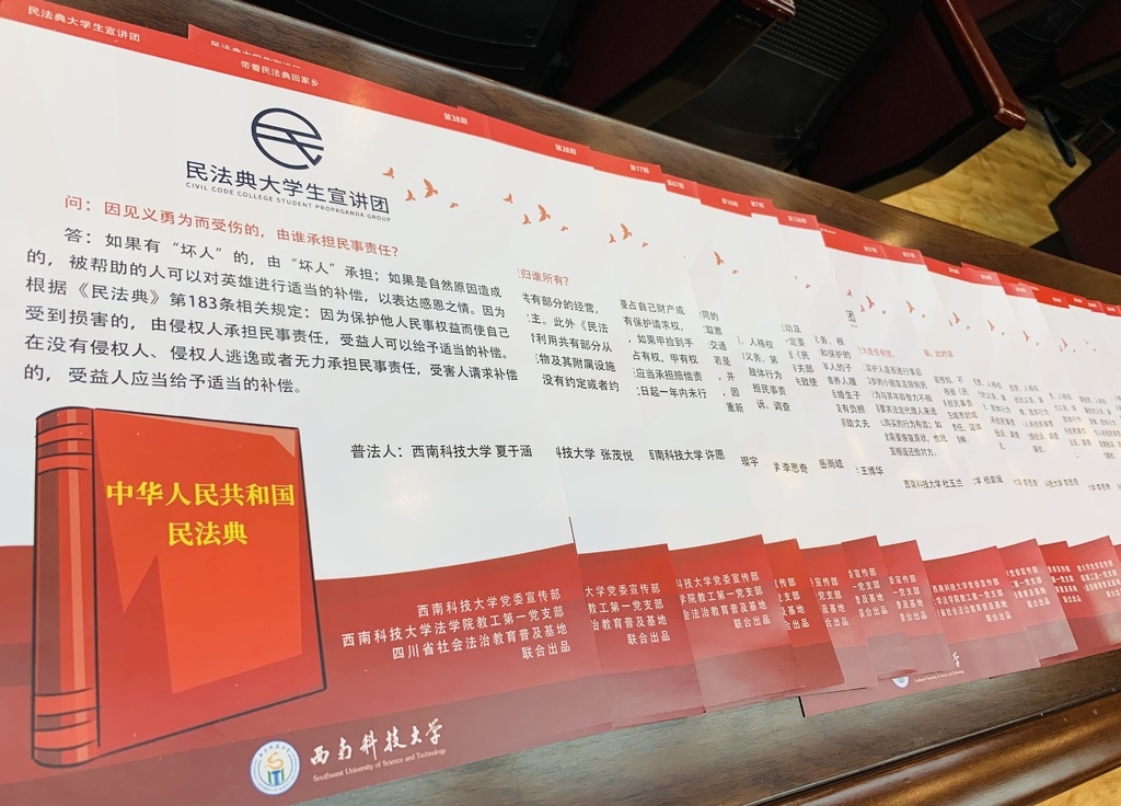 英烈的人格权益受法律保护,见义勇为者无需承担民事责任,催人还款的诉讼时效为三年,小区电梯内广告收入归业主共有……寒假期间,西南科技大学民法典大学生宣讲团积极开展“带着民法典回家乡”活动,多种方式宣传“社会生活的百科全书”,多种角度展示科大学子风采。该活动由学校党委宣传部、四川省法治教育普及基地联合发起,法学院教工第一党支部全程指导与培训。