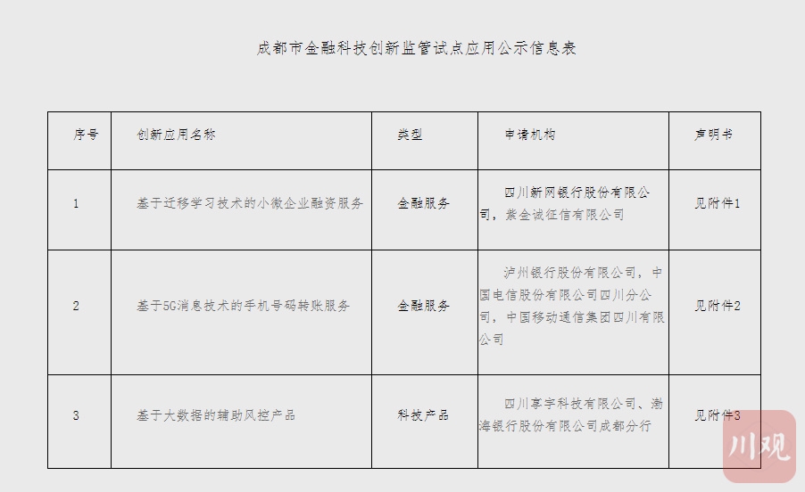 这3个应用分别是四川新网银行股份有限公司、紫金诚征信有限公司申请的“基于迁移学习技术的小微企业融资服务”;泸州银行股份有限公司、中国电信股份有限公司四川分公司、中国移动通信集团四川有限公司申请的“基于5G消息技术的手机号码转账服务”、四川享宇科技有限公司、渤海银行股份有限公司成都分行申请的“基于大数据的辅助风控产品”。
