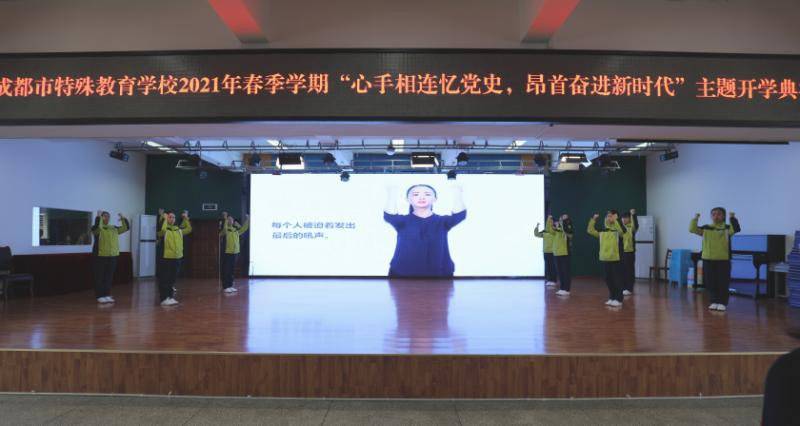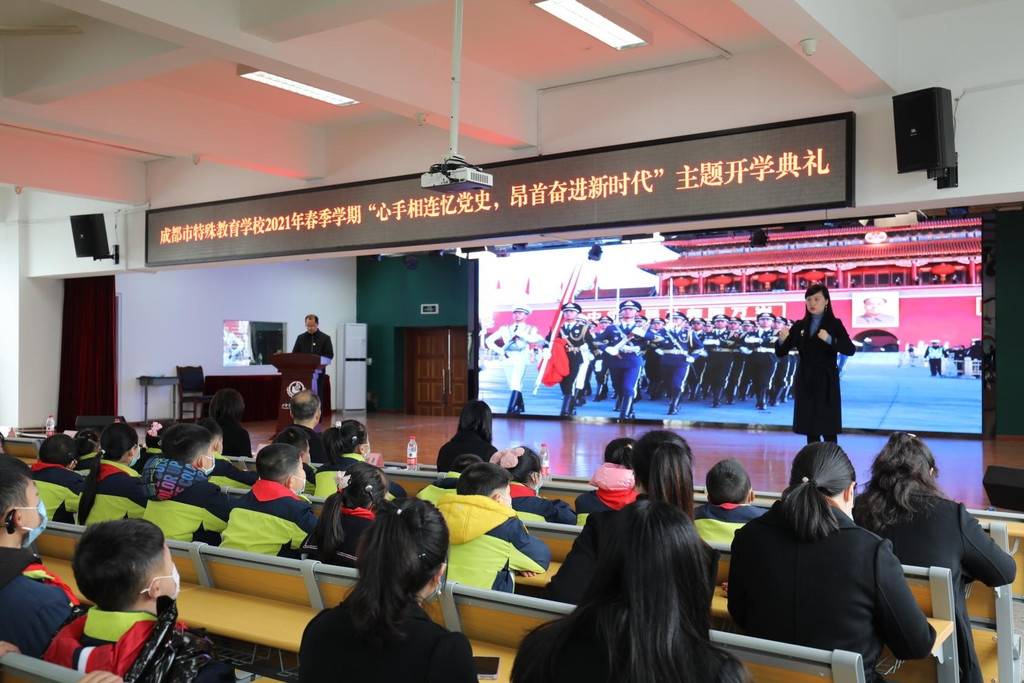 为纪念中国共产党成立一百周年,开展党史国情教育,进一步激发广大师生爱党爱国热情,当天,成都市特殊教育学校举办了“心手相连忆党史,昂首奋进新时代”——2021年学校开学典礼暨纪念建党一百周年活动,四川省残联、教育厅、省聋人协会等相关单位应邀参加了活动。