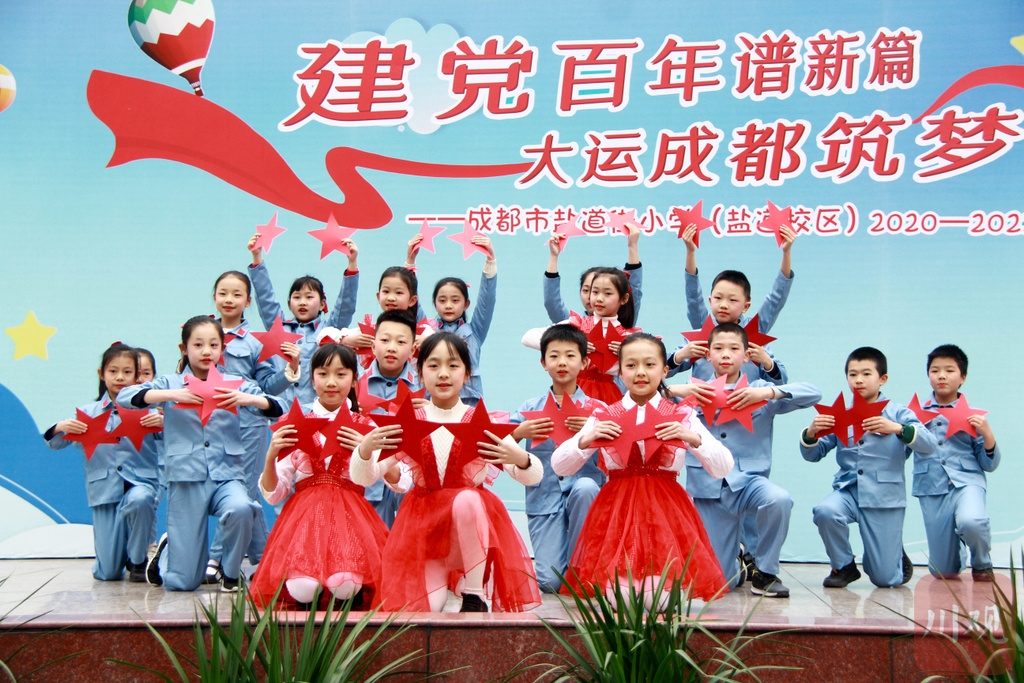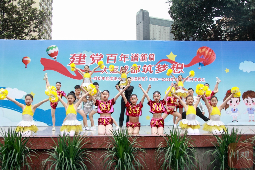 伴随着极具韵味的川剧音乐,盐小学生们用板凳舞带来律动。他们时而聚拢,时而散卉,用传统艺术和创意舞蹈的融合拉开了新学期的帷幕。四川在线记者了解到,本次开学典礼分为“建党百年铸魂”“环保志愿筑美”“大运成都筑梦”三个篇章,旨在迎接党的百年华诞、拥抱世界大学生运动会,以及推行施行垃圾分类。