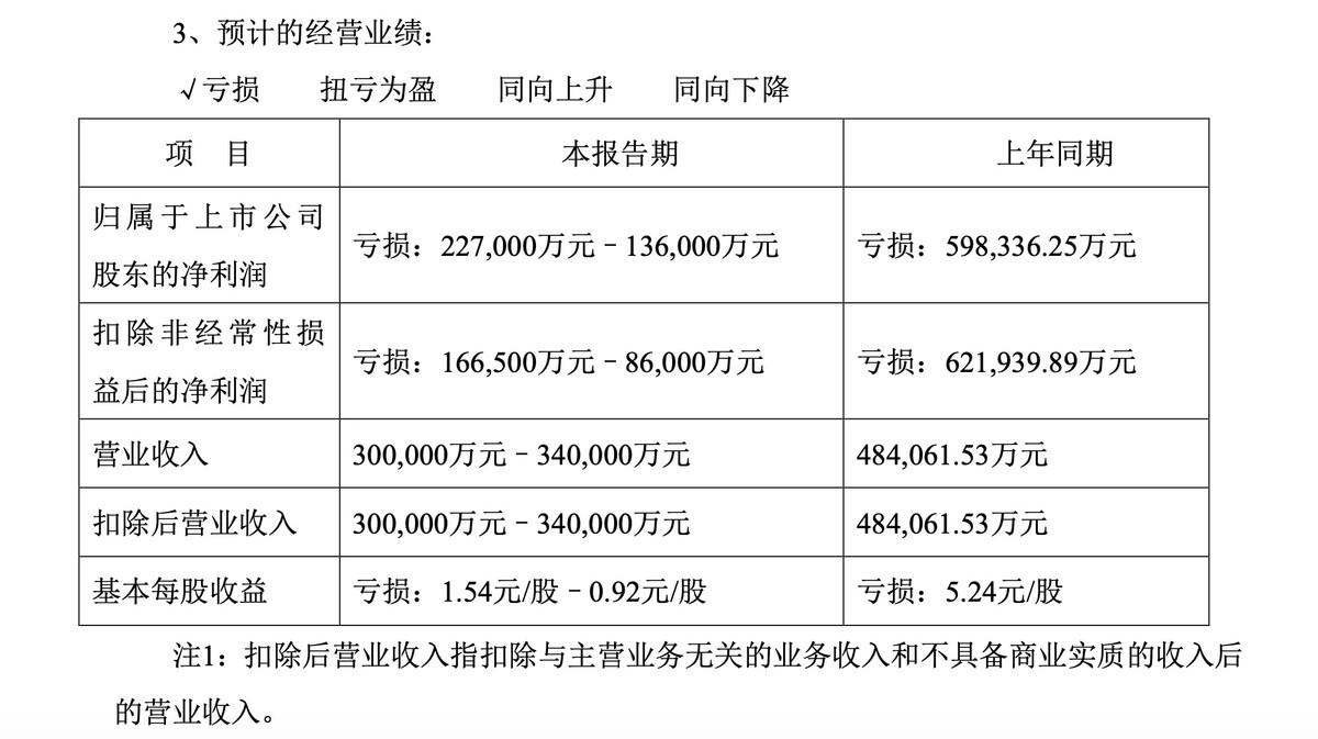 早些时间,该公司发布2020年度业绩预告显示,在2020年1月1日至2020年12月31日时期内,公司营业收入300,000万元–340,000万元,归属于上市公司股东的净利润亏损227,000万元–136,000万元,基本每股收益亏损1.54元/股–0.92元/股,营业收入、归属于上市公司股东的净利润与基本每股收益亏损均较2019年有所下降。