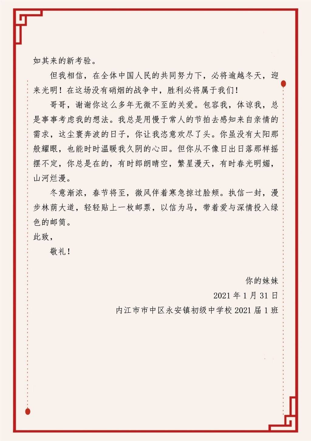 近日,“齐心助力抗疫情,一封家书连亲情”主题教育活动在内江市东兴区、市中区两地启动。两地组织区域内4到9年级学生写一封家书,向身边或在外地的一位亲人说出自己的节日问候、学习生活近况、家乡变化等,传递温情与感恩,凝聚奋进力量。