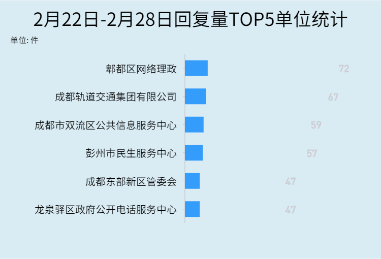 从具体接件转办单位来看,全川转办回复量排名上前五的单位分别为: