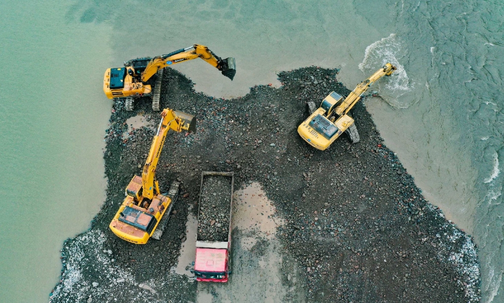 不久前,在青衣江雅安雨城区多营段,十几台挖掘机和工程车来回配合作业,疏浚河道。黄刚摄(视觉四川)