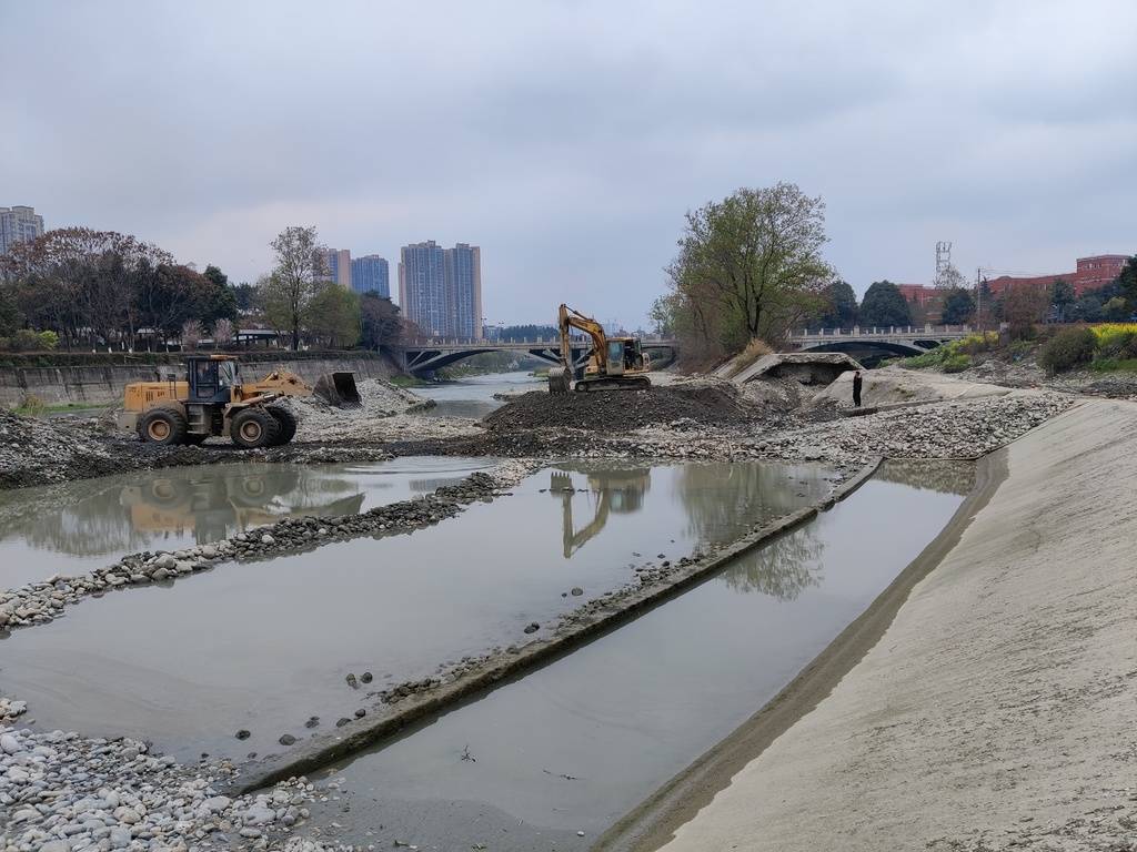 2月28日下午,位于成都市新都区龙门堰的一处施工现场,两台挖掘机正在河道内进行疏浚作业。