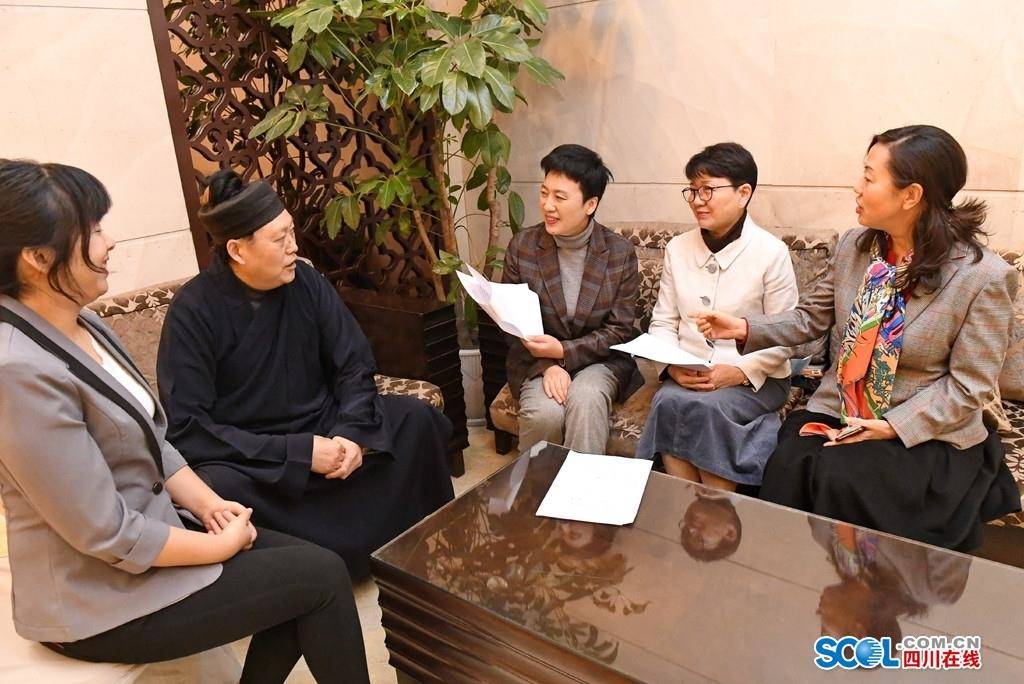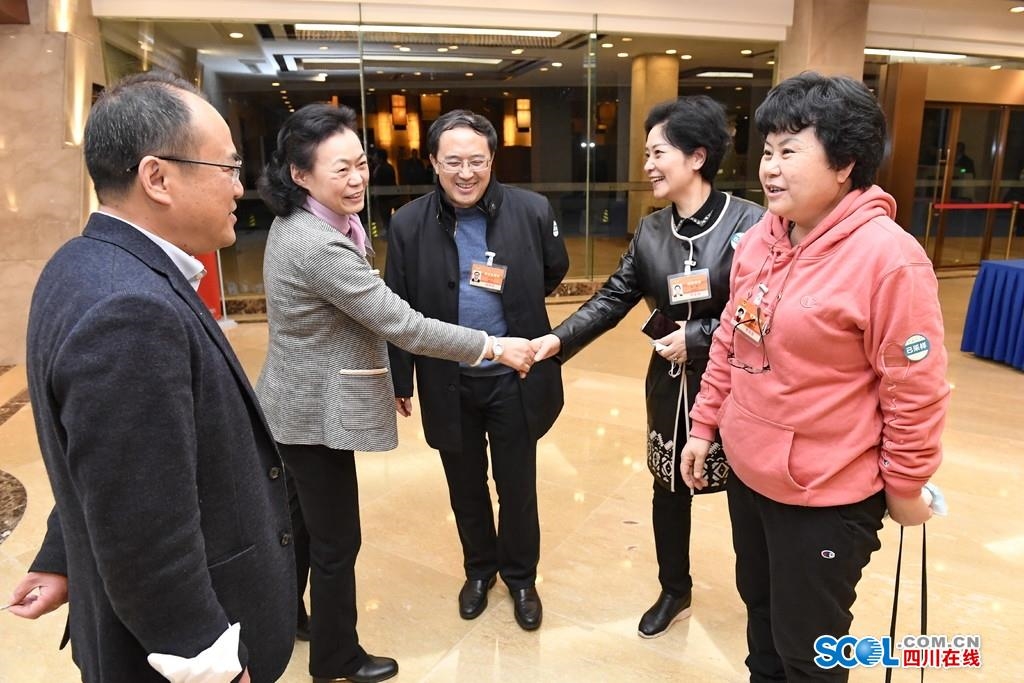 仰协委员(右一)、曾蓉委员(右二)、冯小明委员(中)、贺盛瑜委员(左二)、曾勇委员(左一)在一起交流履职心得。