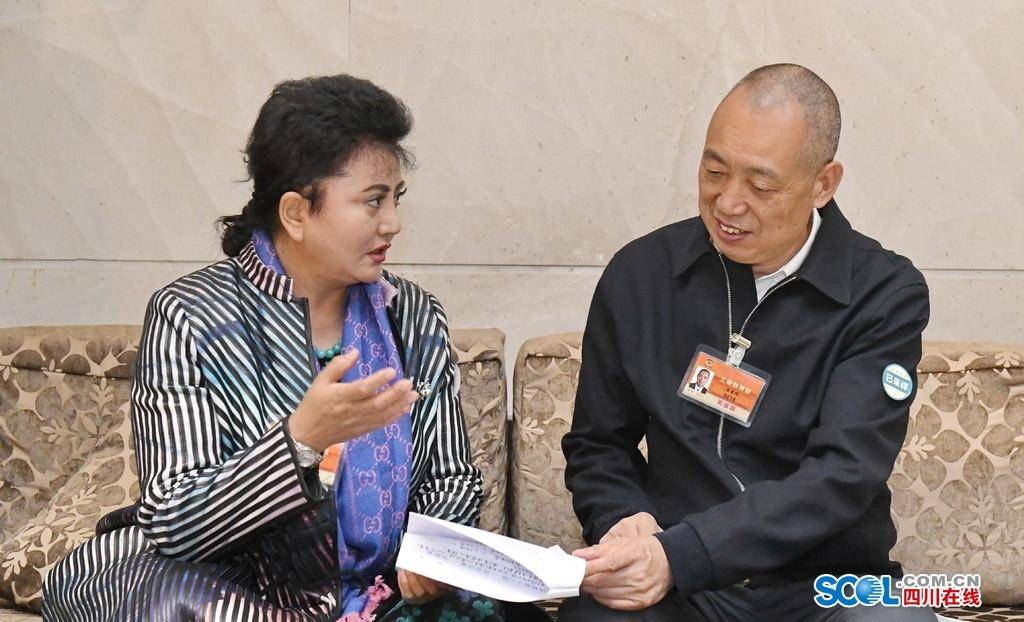 郭瓦加毛吉委员(左)与张建明委员交流履职心得。