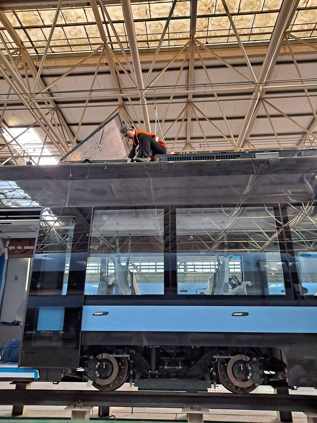 众所周知,城轨列车最大的特点便是有一条长长的“辫子”,这条“辫子”通过“攀附”在架在列车上空的电缆上为列车供电。从外观上来看,全国首台新型无线供电制式城轨车辆最大的改变便是摆脱了这条“辫子”,和城市景观融为一体,达到更加美观的效果。