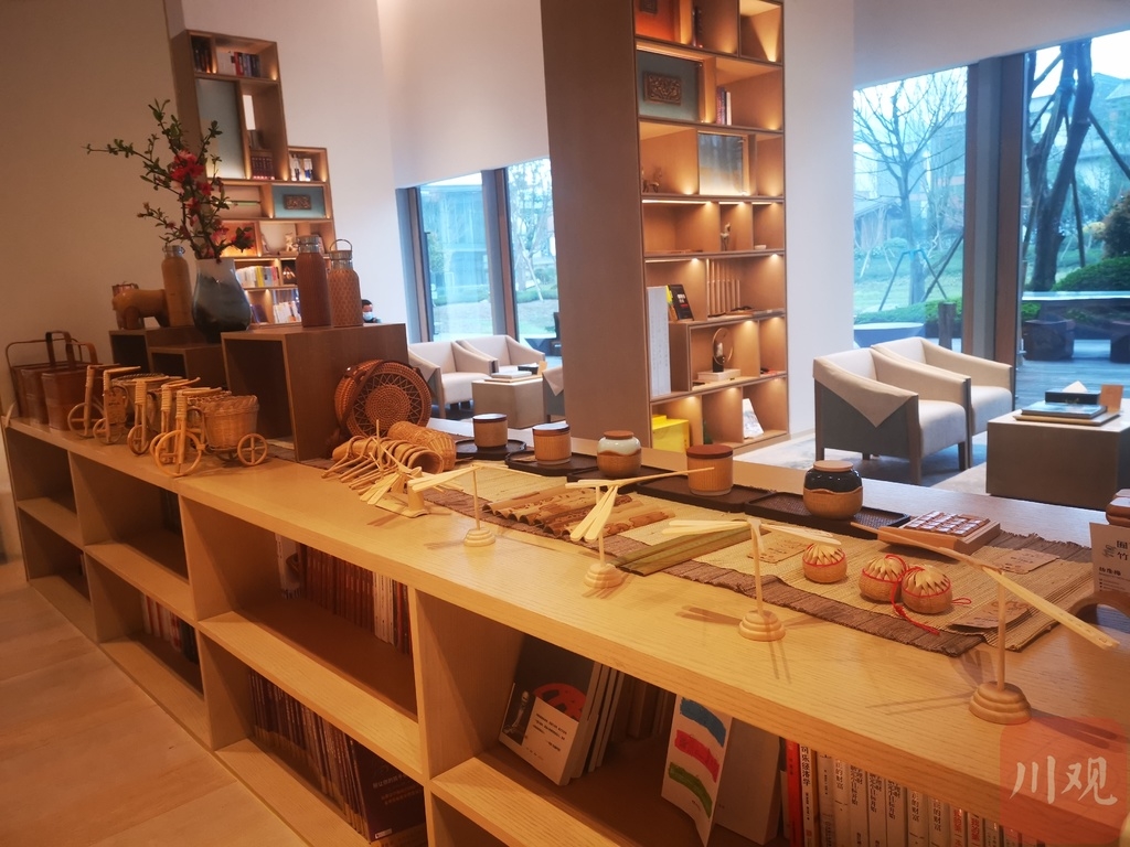 书院还展出了不少崇州当地的非遗产品,比如道明的竹编、街子镇的汤麻饼等。书院不光为这些产品进行代售服务,还会与非遗人合作,对产品的包装进行提档升级,扩大产品销售渠道,增加当地居民的收入。
