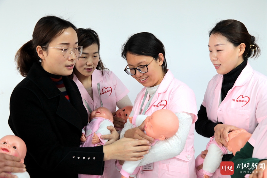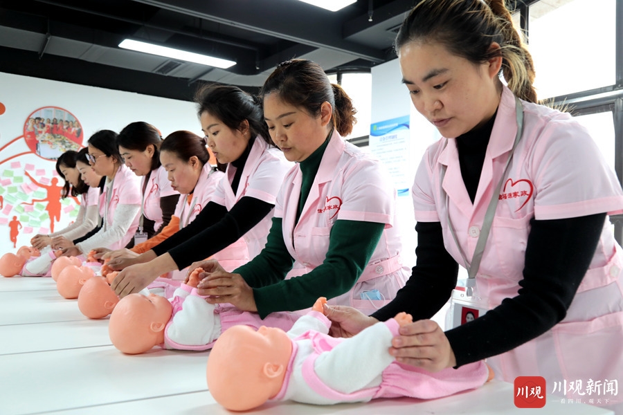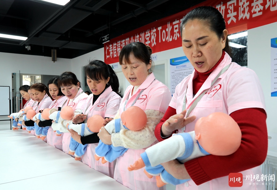 3月4日,在仁寿县信福源职业培训学校,培训老师正在为妇女们讲解婴儿护理技巧。