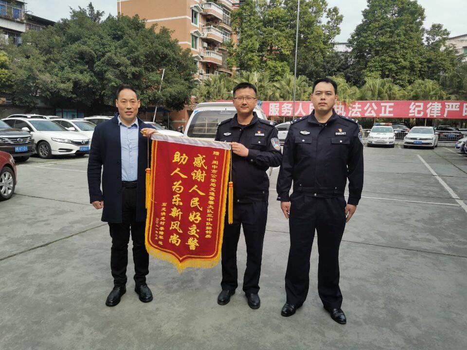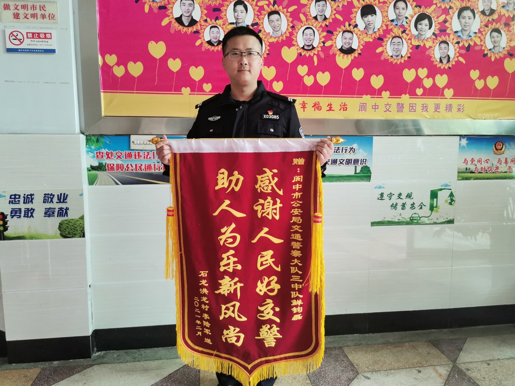 近日,驾驶员李某某一行四人手捧“感谢人民好交警、助人为乐新风尚”一面锦旗来到阆中市公安局交警大队营区,向三中队辅警鲜均磊送达感激之情。
