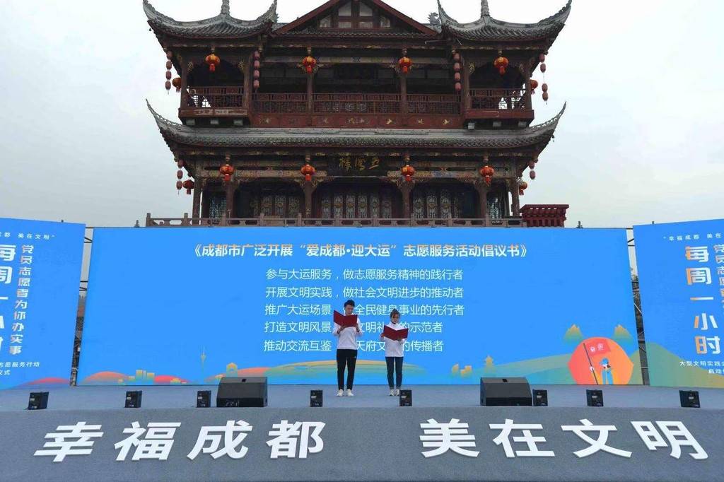 启动仪式上,成都市文明办、大运会执委会志愿者部、市志愿服务联合会共同向全市广大志愿服务组织、志愿者发出了广泛开展“爱成都·迎大运”志愿服务活动的倡议。倡导市民积极参与大运服务,做志愿服务精神的践行者;开展文明实践,做社会文明进步的推动者;推广大运场景,做全民健身事业的先行者;打造文明风景,做文明礼仪的示范者;推动交流互鉴,做天府文化的传播者。大力弘扬奉献、友爱、互助、进步的志愿精神,用热情服务大运,向世界展现最有活力的成都。