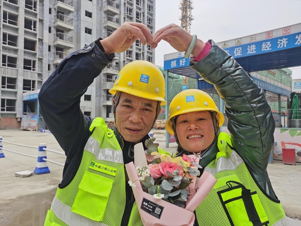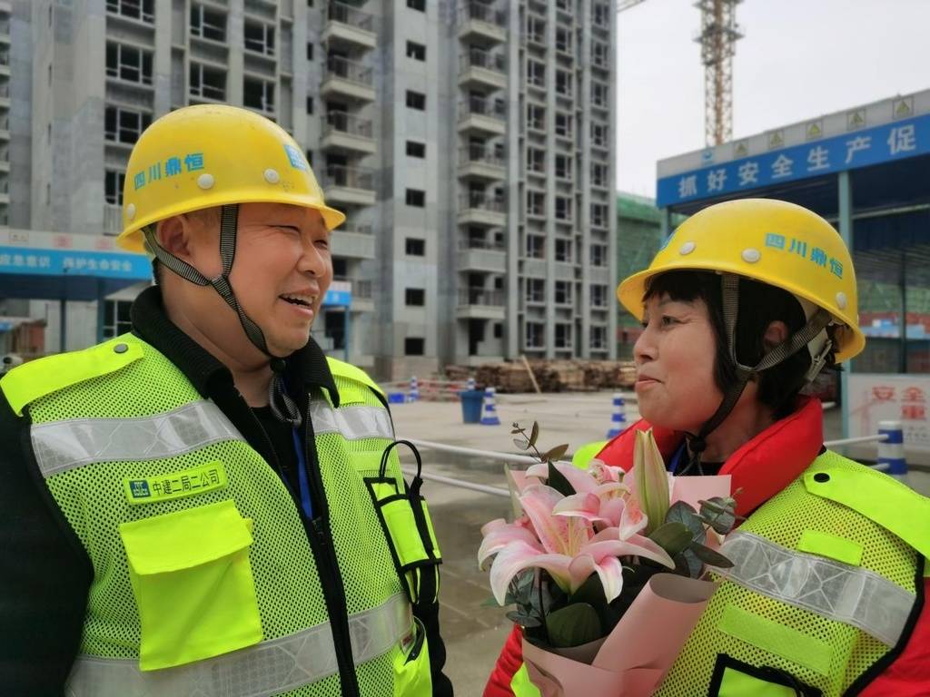 “大臂向右,注意慢点落钩。”此时,李梦菊还在自己的工作岗位上认真地指挥塔吊施工。在她熟练的指挥下,塔吊安全地将材料吊运至施工楼层。她不会想到,接下来,浪漫的一幕即将到来。代中吉手捧玫瑰,慢慢出现在李梦菊的身后,突然将花举到她面前。