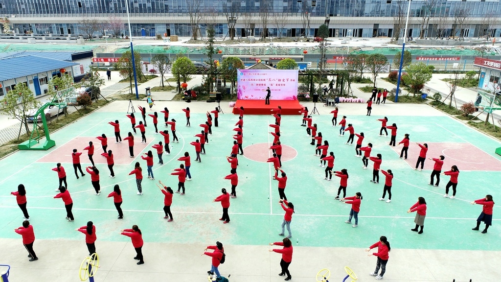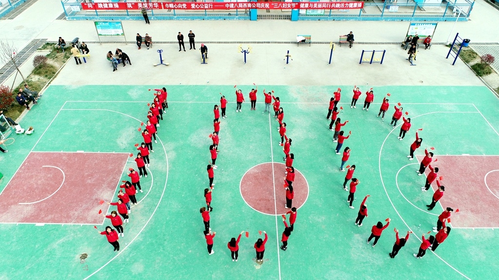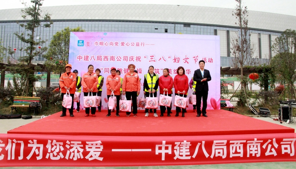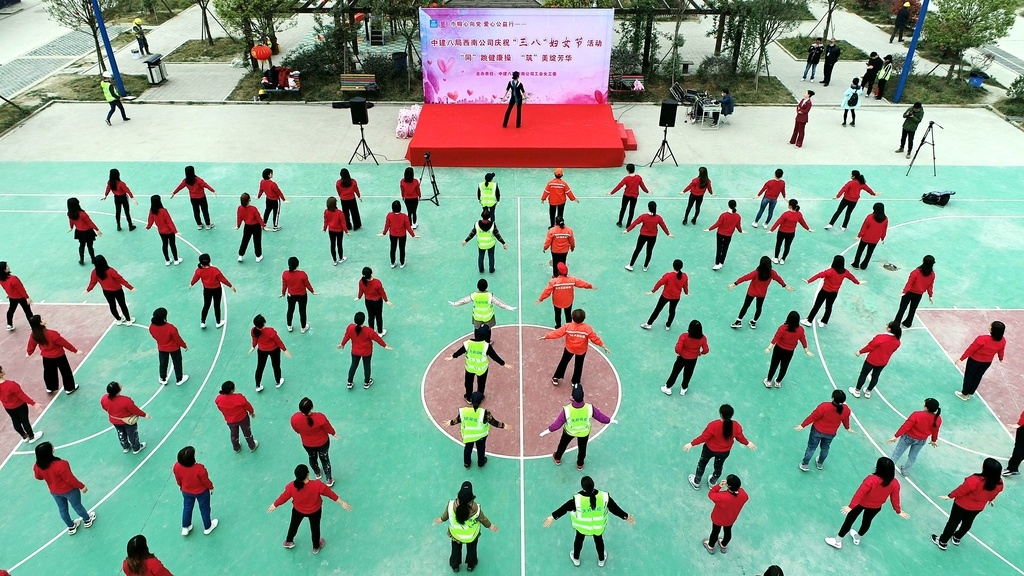 为热烈庆祝第111个“三八”国际劳动妇女节,激发女职工的劳动热情和创造活力,3月5日下午,中建八局西南公司工会女工委组织开展了“同”跳健康操,“筑”美绽芳华庆祝“三八”妇女节系列活动,让广大女性同胞健康与美丽同行,单位女职工、女农民工代表、成都市女环卫工代表共100余名女性同胞参与活动。