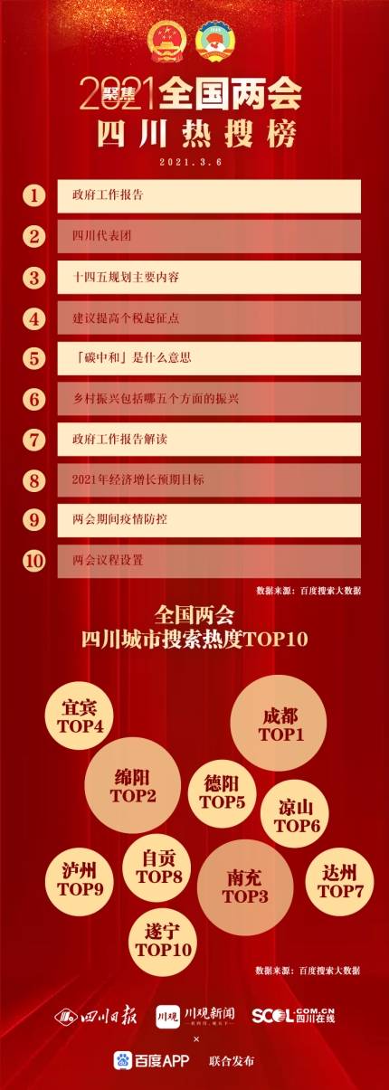 3月5日至3月11日期间,四川在线联合知乎、百度两大平台,每天发布“2021全国两会话题榜”和“2021全国两会四川热搜榜”两大榜单,依托平台权威数据和智能分析,为你开启两会热点全网追踪,欢迎持续关注!