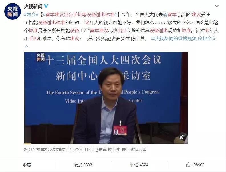 今年,全国人大代表@雷军 提出的建议关注了智能设备适老标准的问题:“老年人的视力可能不好,我们怎么显示足够大的字体?怎么能把这个标准贯穿在所有智能设备上?”雷军建议尽快出台完整的信息设备适老规范和标准。