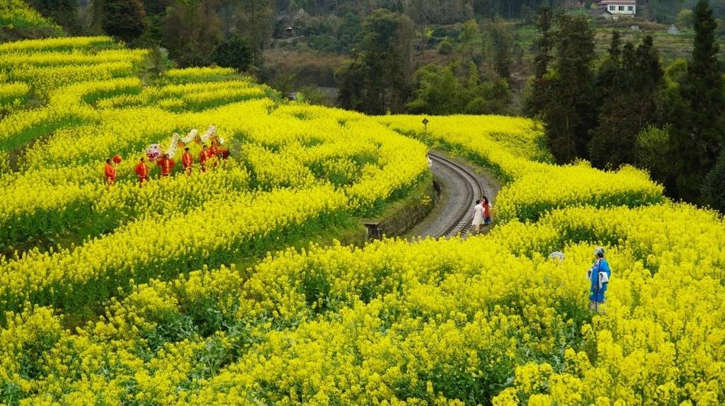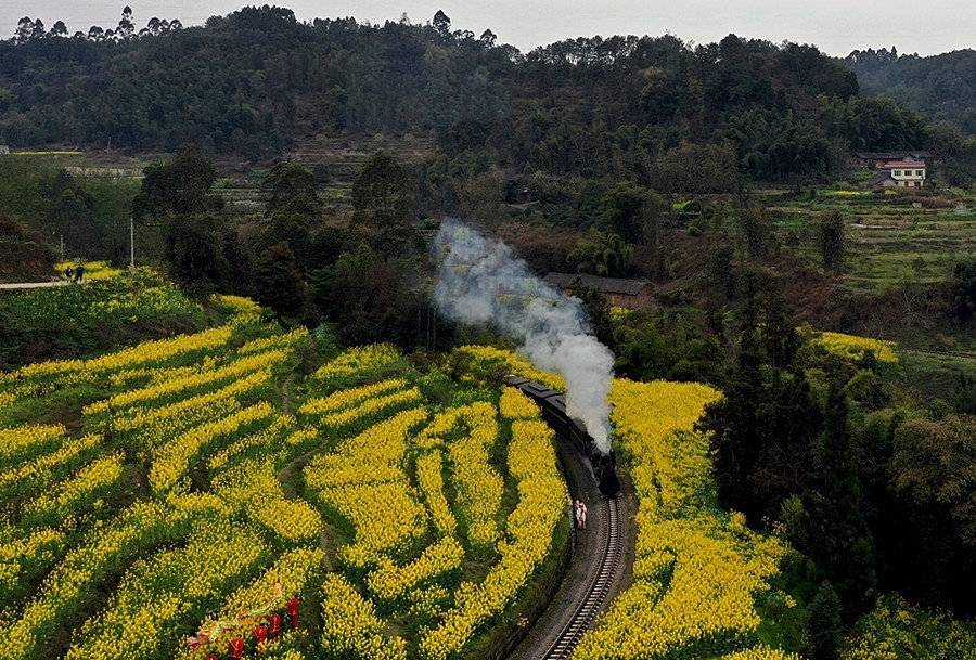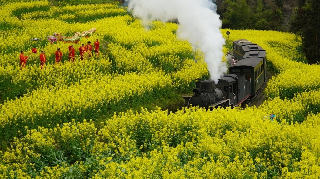 当G字头的高铁以300公里的时速在全国主干道铁路上行驶时,时速30公里不到的嘉阳小火车,穿梭在春花烂漫间。这辆“绝版”的小火车,在“咣当咣当”的慢游中,沿途油菜花海包围,如劈开金色的浪。成片的桃花、李花,更让人仿佛感觉到了世外桃源。