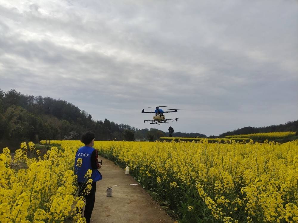 3月8日,在北川永昌镇福田村、裕清村、川主村等油菜主产区,一架架无人机正在开展飞防作业。装机、调试、起飞……在工作人员的操作下,搭载着调配均匀药液的无人机,按照预先设定的航线,在成片的花海间快速喷洒着药液。据现场技术人员介绍,无人机喷洒的是经过专业配比的药液,具有防菌核病、防蚜虫等功效,从而确保油菜稳产增收。