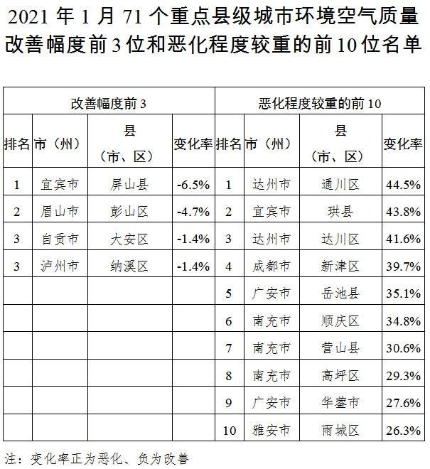 值得关注的是,今年1月,在全省71个重点县级城市中,空气质量改善幅度前3名依次为屏山县、眉山市彭山区、自贡市大安区和泸州市纳溪区(并列);空气质量恶化程度较重的前10名依次为达州市通川区、珙县、达州市达川区、成都市新津区、岳池县、南充市顺庆区、营山县、南充市高坪区、华蓥市、雅安市雨城区。